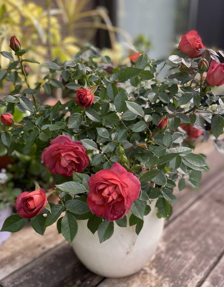 去年買ったミニバラ「コーヒーオベーション」がたくさん咲いているので🌹
