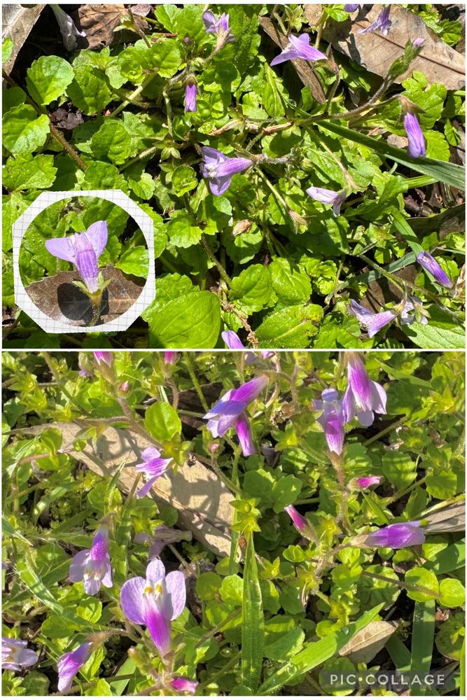 舗装路の横の空き地に、小さな地面にへばりついてる野草、ムラサキサギゴケとトキワハゼ😍