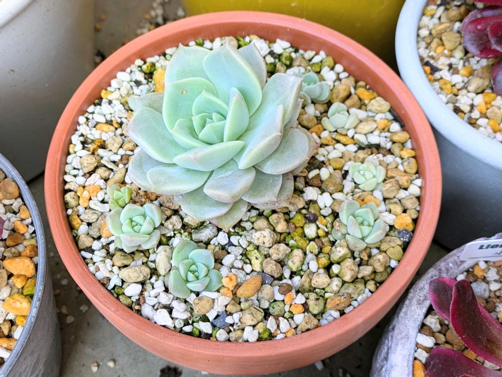 中心の大きい親株と、親株から増やした葉挿しちゃんたち✨