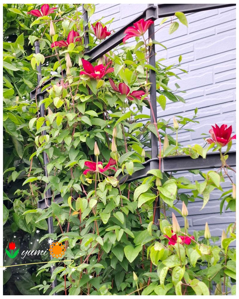 お世話する公園のクレマチス花壇も、この赤いクレマチスがオベリスクに絡んで咲いてます。⚠️確認したら赤はまだ咲いてない。もう少し紫寄りだった🙏