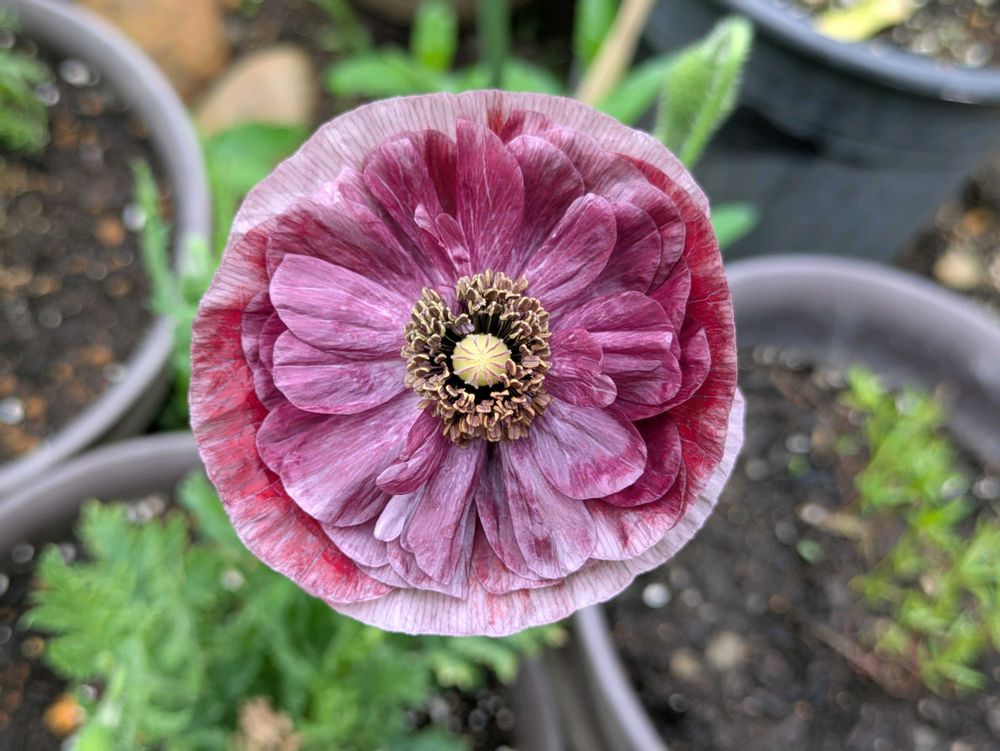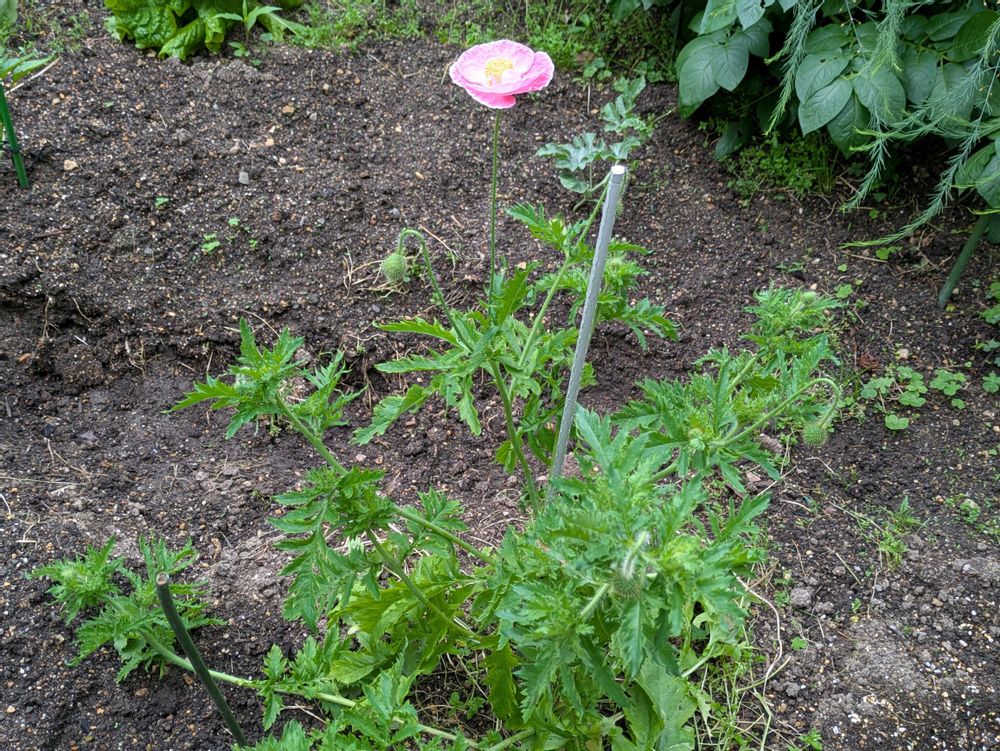 満開のジャーレーポピーは、毎年種を採って蒔いています。今朝は、茎に色別のテープを付けました。🩷🤍♥️