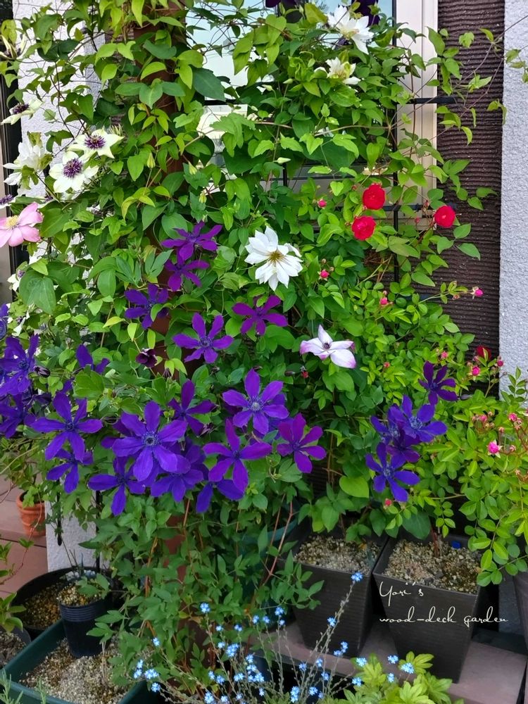 有り難うございます〜☺️💞1枚目は別の場所のクレマチス達で遅咲きさんだけの構成なの♪イツメンの紫グラデーションに赤系の子を合わせたら賑やかになりました🤣💕
