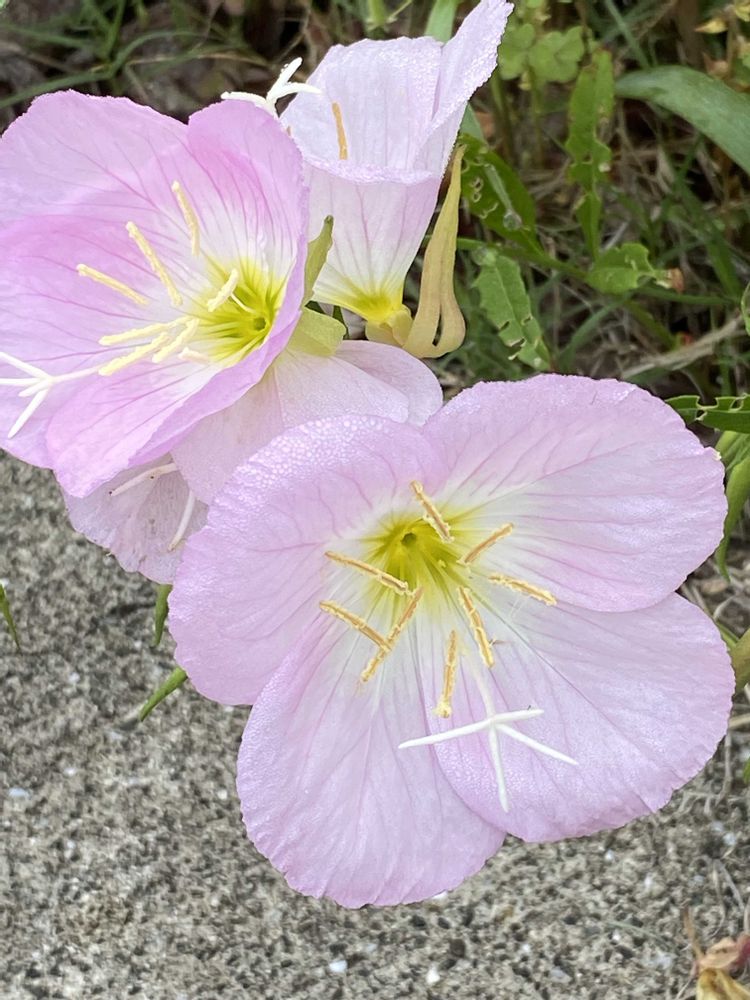 駐車場のすみに ヒルザキツキミソウ ハルジオンに囲まれて賑やかです🌸🎵🎶
