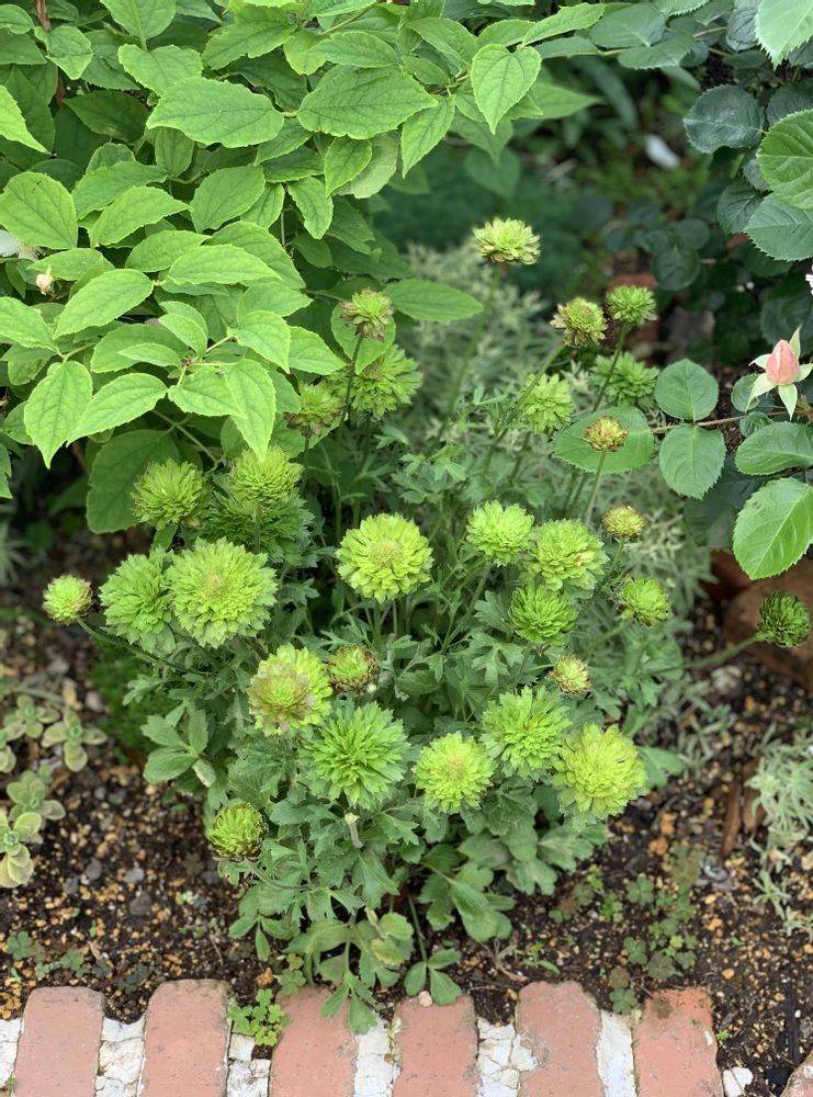 緑色の花その① ラナンキュラスグリーン。1枚目の方は朝日が当たる場所に植えてみた。オレンジっぽい発色をしてる。2枚目のほとんど緑色の方はバイカウツギの株下に植えた為に西日しか当たらないけど、こちらの方がよく育っている。去年までは全く同じ育ち方をしていたのにね。