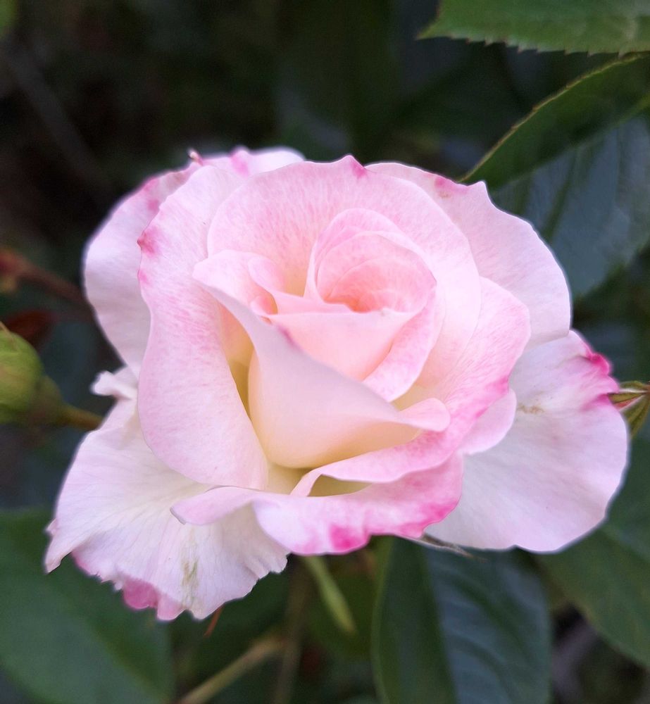 淡いピンクに複色が特徴の、丸弁咲き、中輪房咲きのお花 微香あり