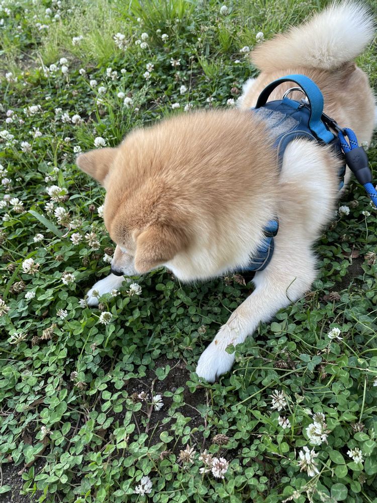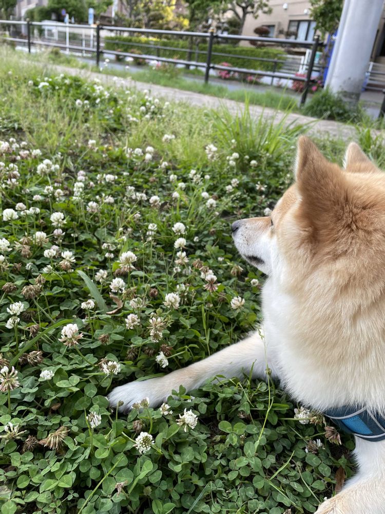 ぽんちゃんはいつもの公園でシロツメクサの絨毯の上で草むしり💧
