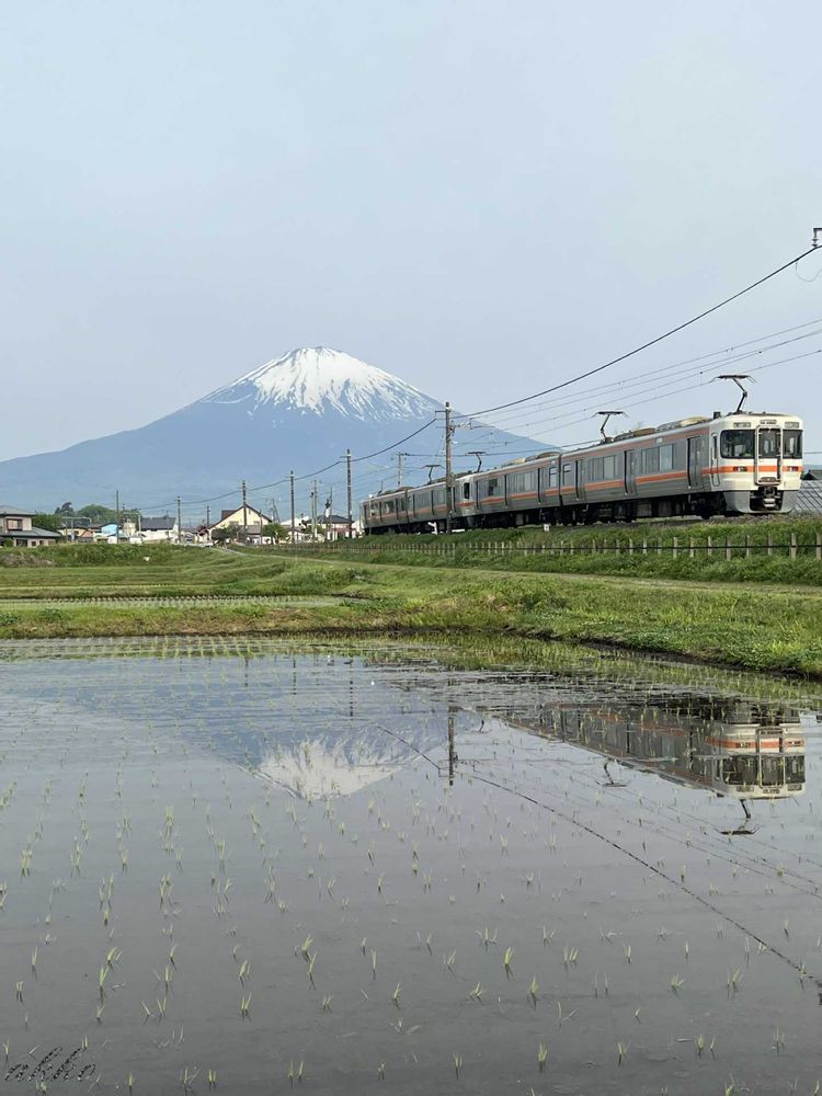 電車も何もかも 田んぼに写って 富士山も スッキリ逆さ富士 良いですね〜👍🎶🎶🎶😊