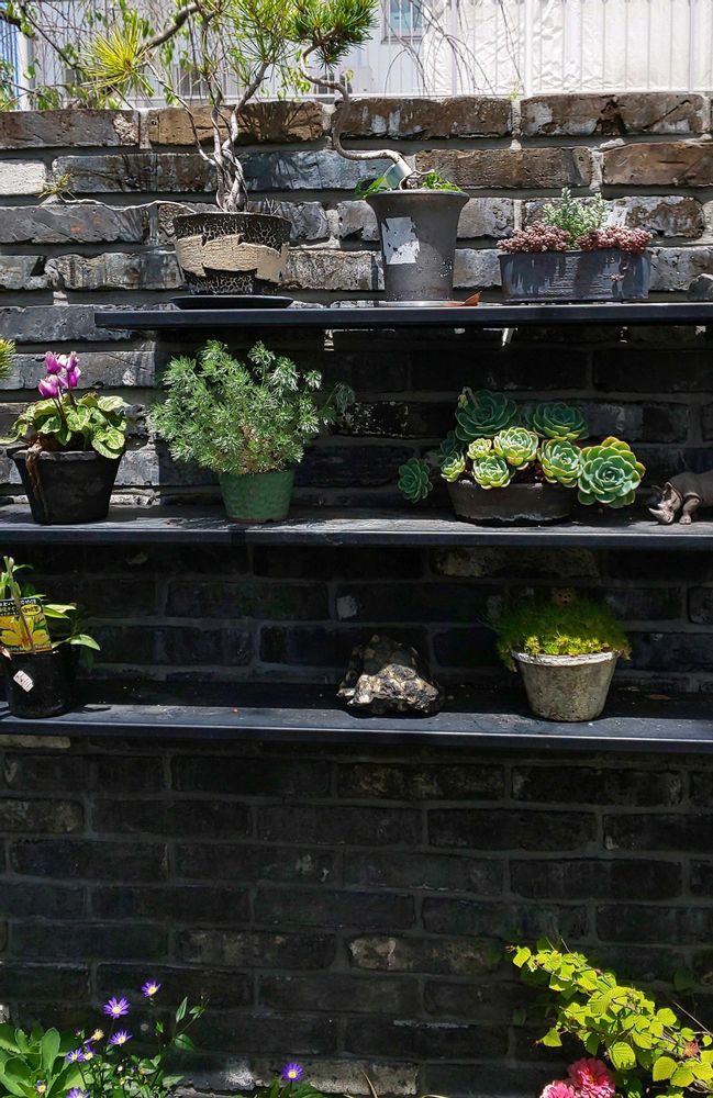 ①渋い石の塀に黒渋い棚が取り付けてありました。
