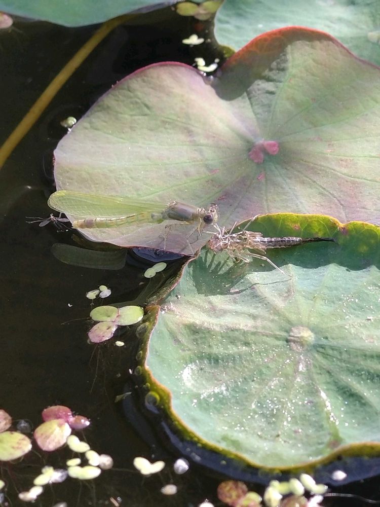 朝に睡蓮と花蓮の水槽を見ると糸蜻蛉が羽化してました。身体が緑なので羽化して間が無いと思います。