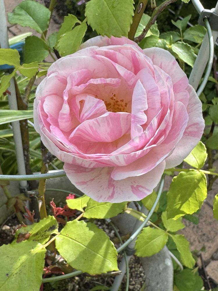 すごく可愛い白と淡いピンクの絞り模様のバラさんですね〜