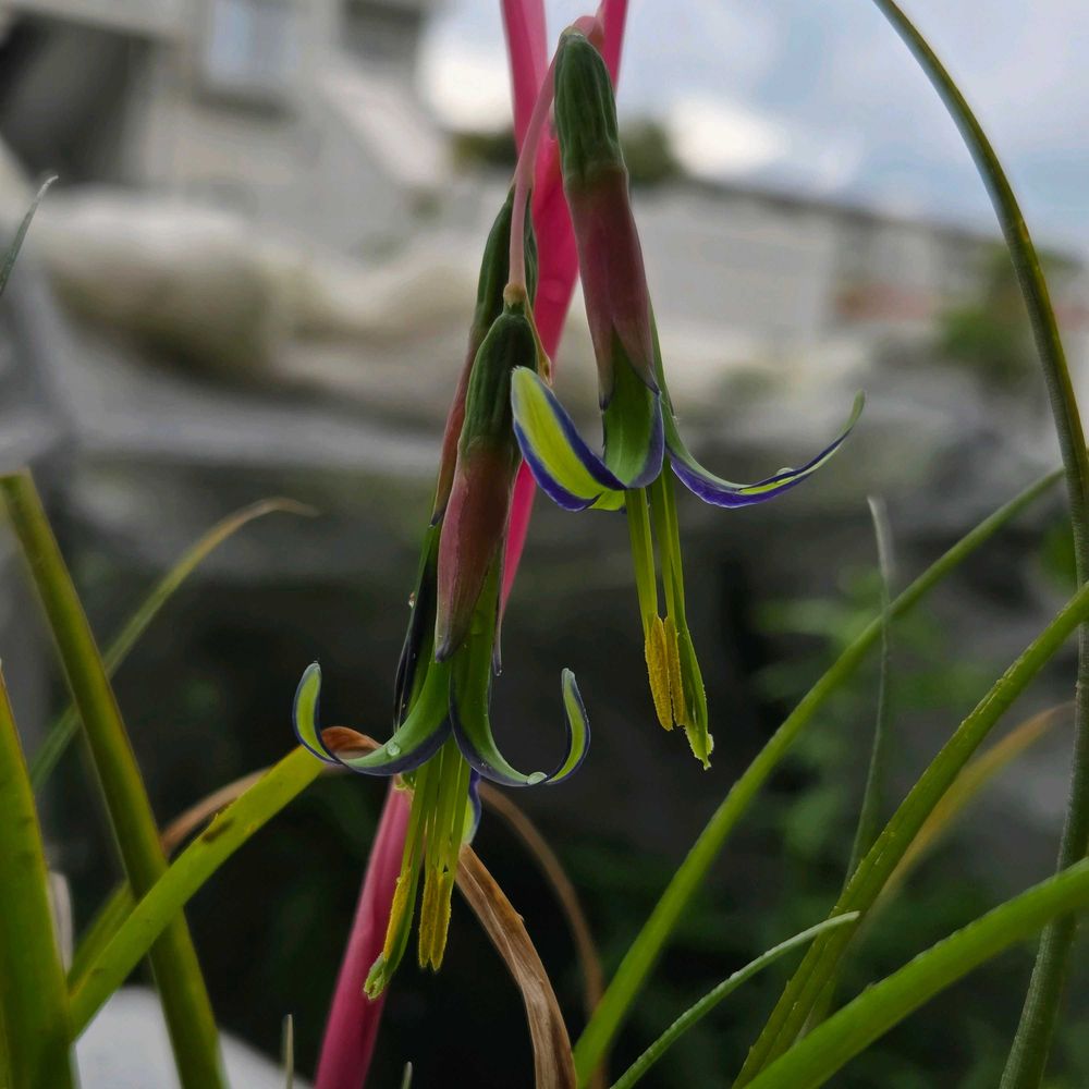 トロピカルな花が咲きました!パイナップルの仲間で意外と寒さに弱そうなイメージですが、ヨウラクツツアナナスは耐寒性が優れていて庭で楽々と屋外越冬しますね😆😆