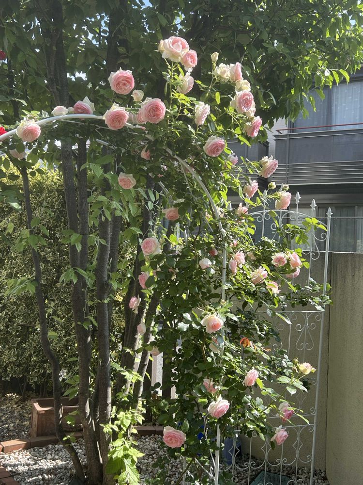 さん、ありがとうございます😊ピエールドゥロンサールは咲くと俯くので、アーチにすると色んな角度から花姿を楽しめて良いです🥰これを毎日見ながら朝くつろげるのは本当に幸せです😍