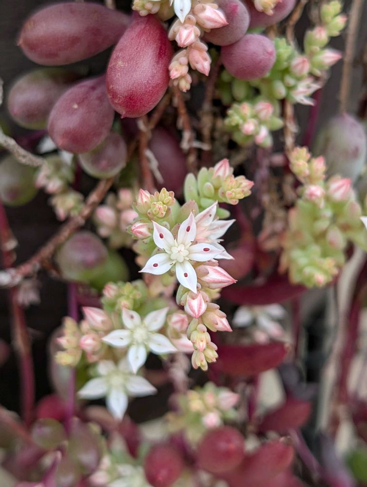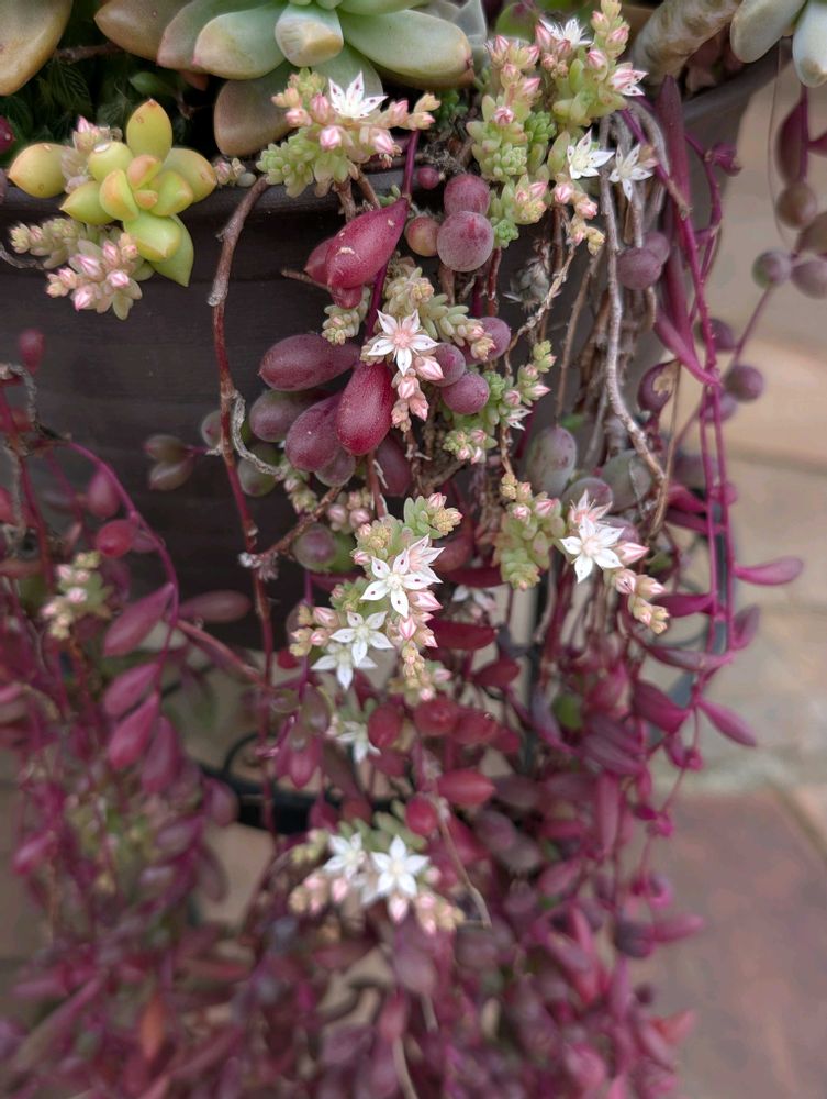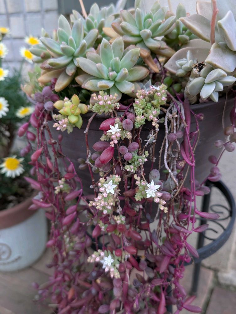 去年の春、多肉を寄植えにしてからずっと放置したままでずが、セダムの花が咲きました😊ルビーネックレスがいい仕事してるな〜💖