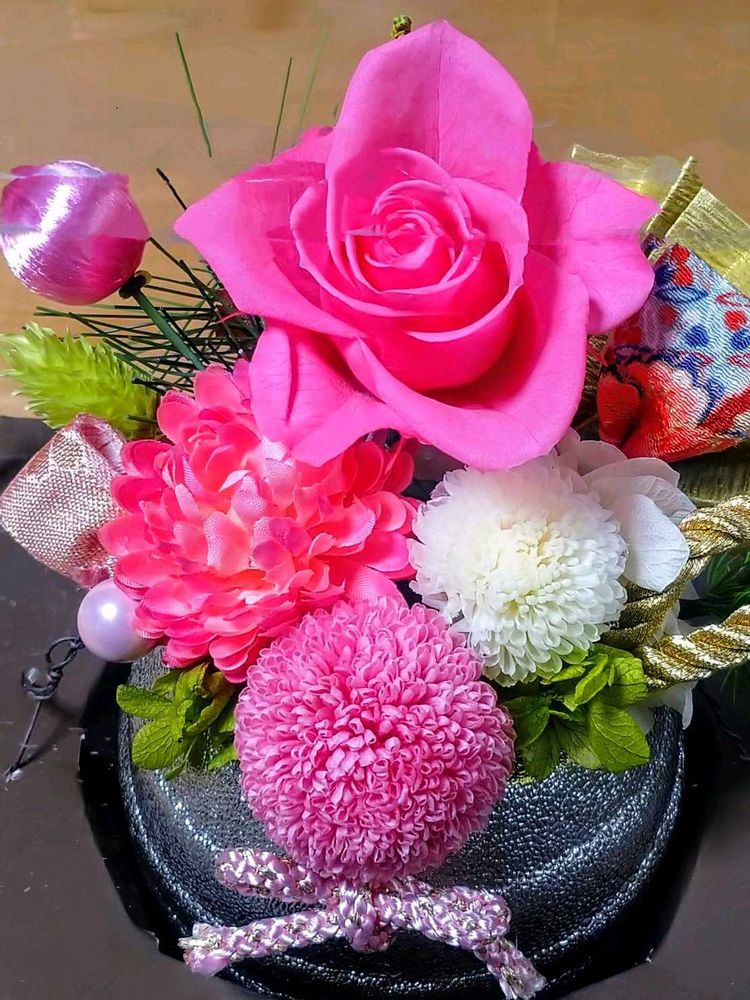 親族の還暦祝に、プリザーブドフラワーのアレンジメントを贈りました。本当は、還暦なので赤が良いと思ったのですが、あいにく母の日と被って、売り切れ。濃いピンクなので、お祝い感はあるかも?と。喜んでもらえたようで、良かったです😊