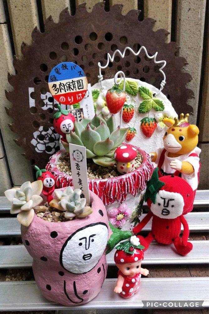 1枚目は、いちごの鉢のまわりに、みんなが集まっています‼️肝心なsawaさんの白いいちご柄が見えてない😱