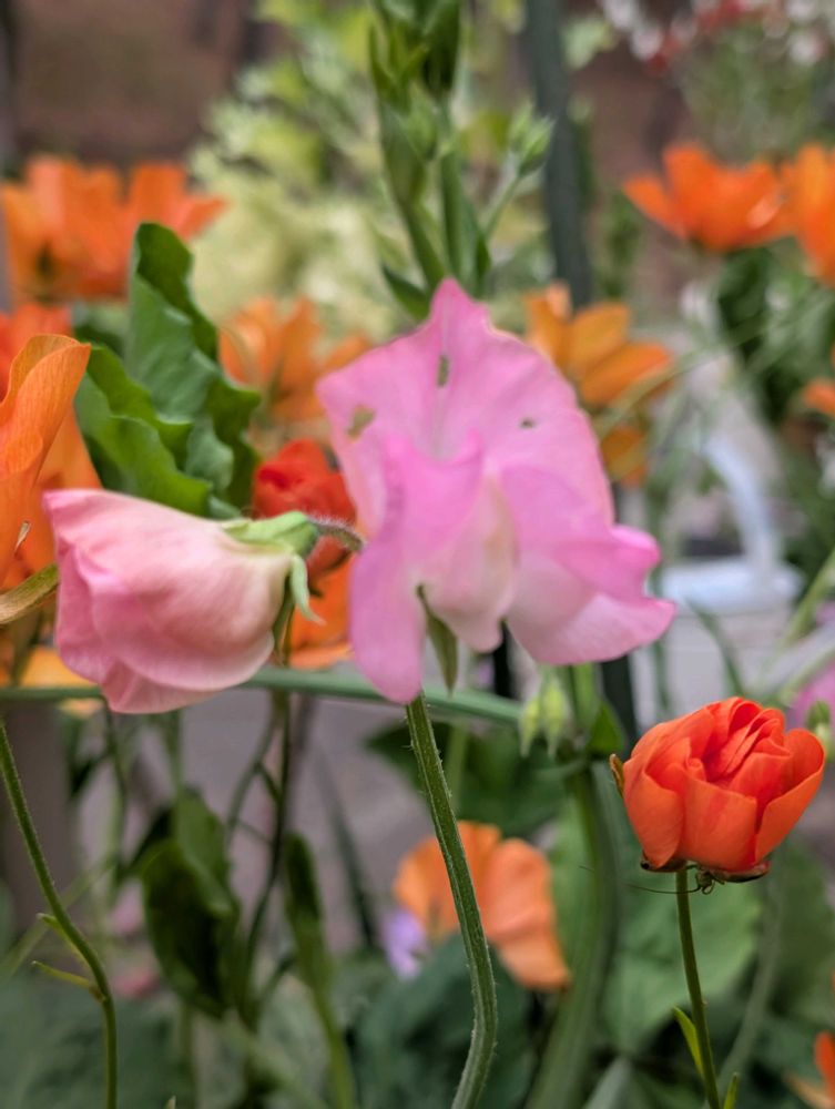 今朝庭🏡スイトピーとラナンキュラスラックス。透ける花、好きです。