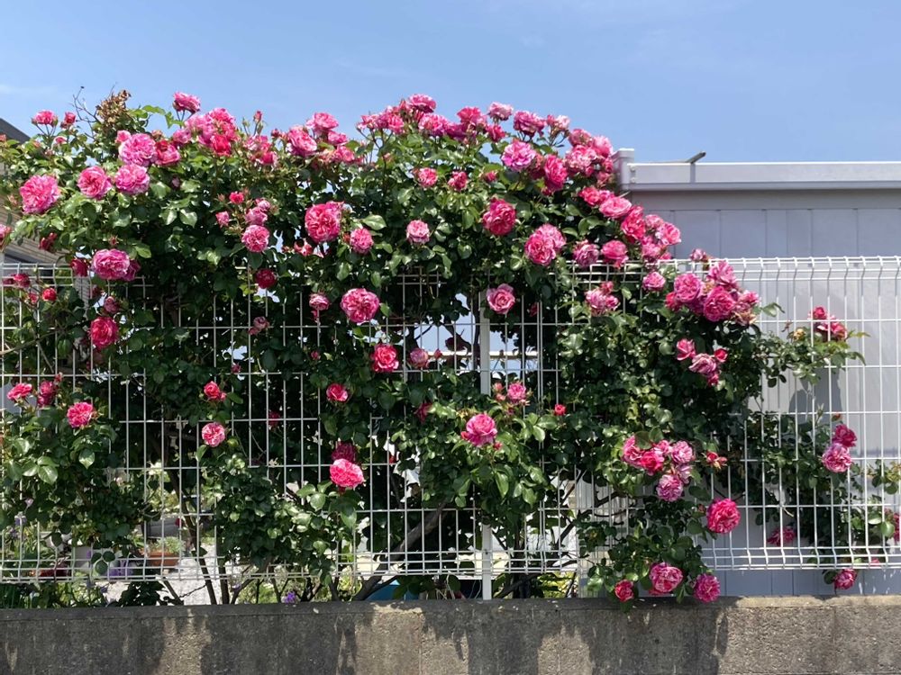 つるバラは枝を横に寝かせるとたくさんの花が立ち上がって咲きます。一番最初に植えた時に左右に引っ張ってフェンスにとじつけました。😊