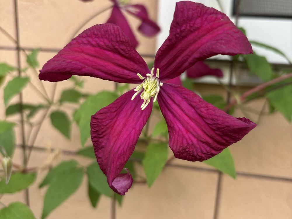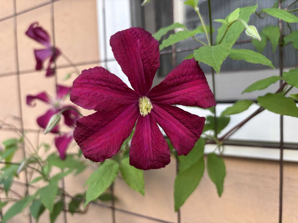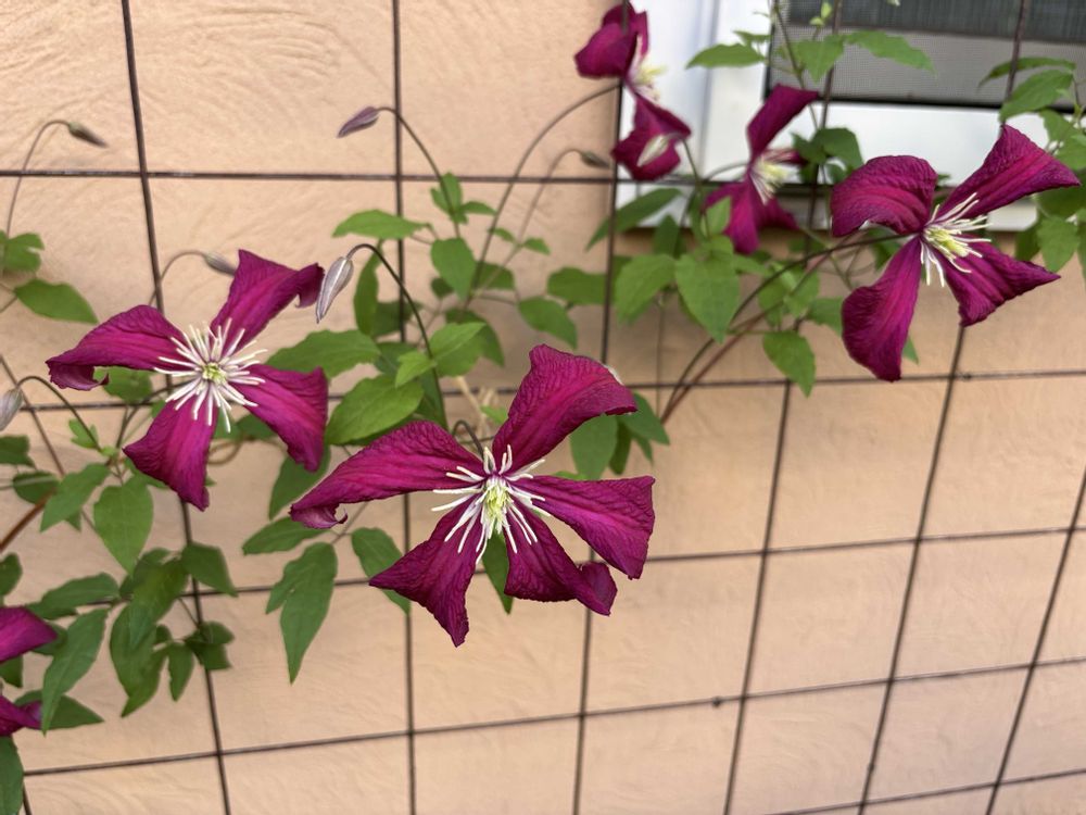 壁面に誘引しているクレマチス マダムジュリアコレボン😊
