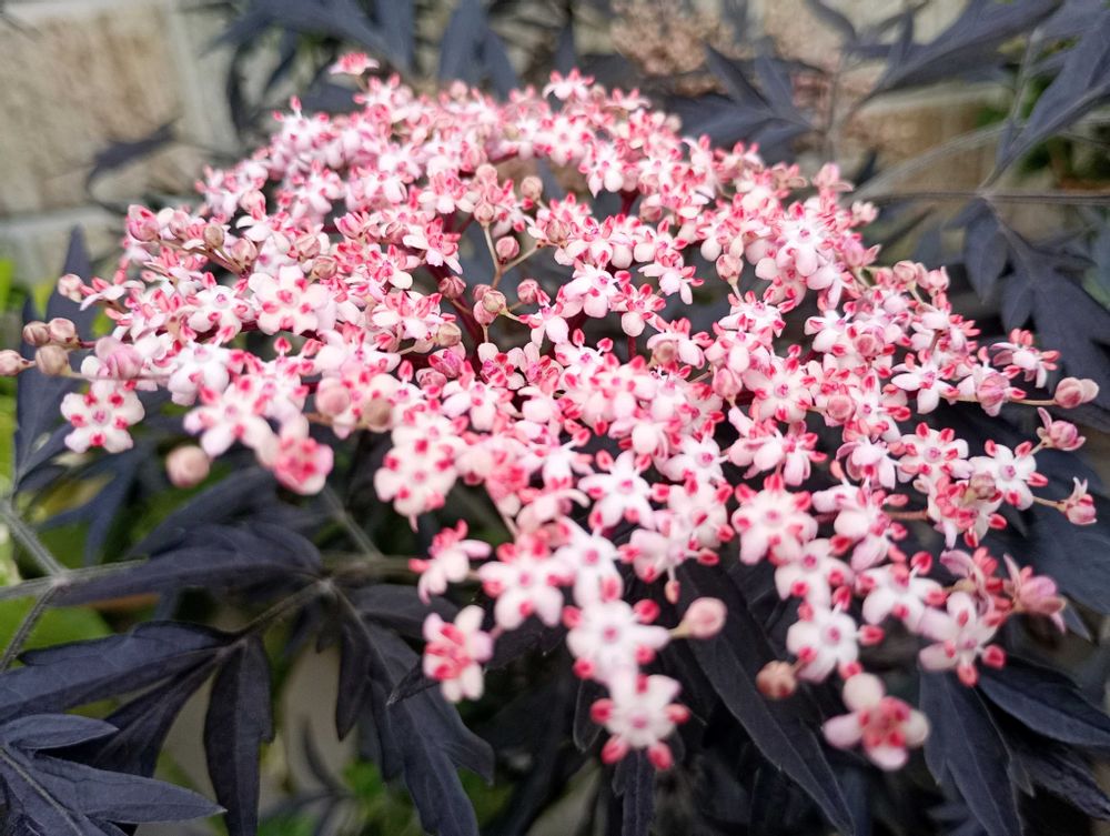 1️⃣🍀😉花友さんから頂いた銅葉の「ニワトコ」🤔❓まる2年経ち、今年はいくつも蕾も付けていましたが、今朝は開花ヽ(^。^)ノです 🔍️【西洋ニワトコ サンブカス ブラックレース】➡️💮💮💮ニワトコの詳しい説明🍀🆙があったのでコメント欄に追記しておきますね😃