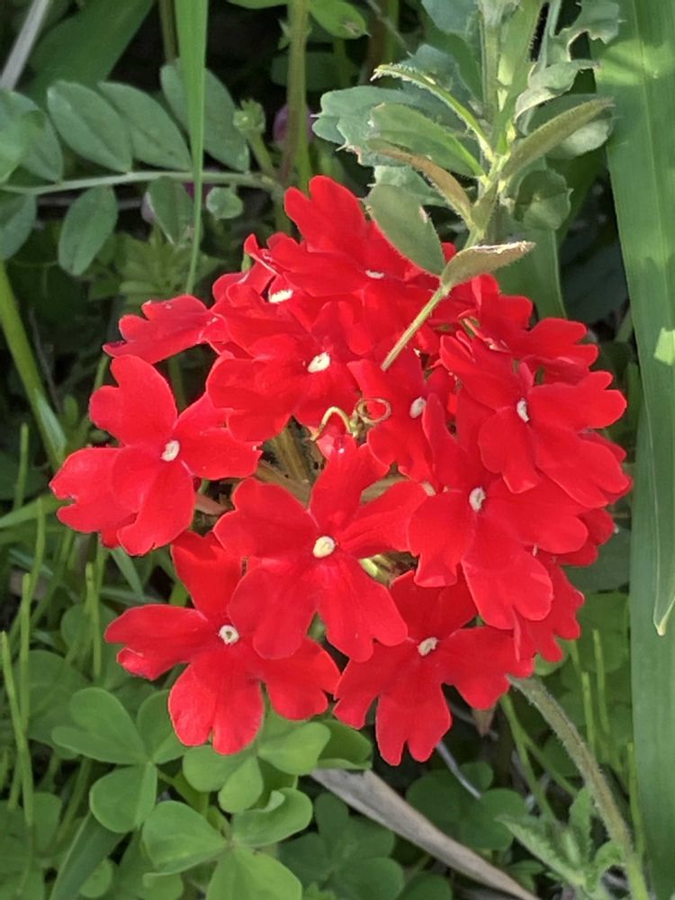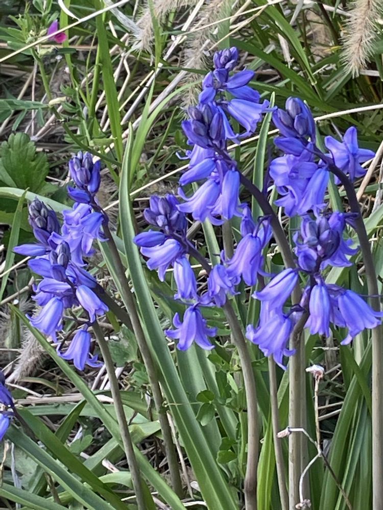 夕日を浴びたスパニッシュブルーベルに見惚れてしまいました。近くには、西洋オダマキ、キャンディタフト、ペラペラヨメナ、ビジョザクラが元気に咲いていました。