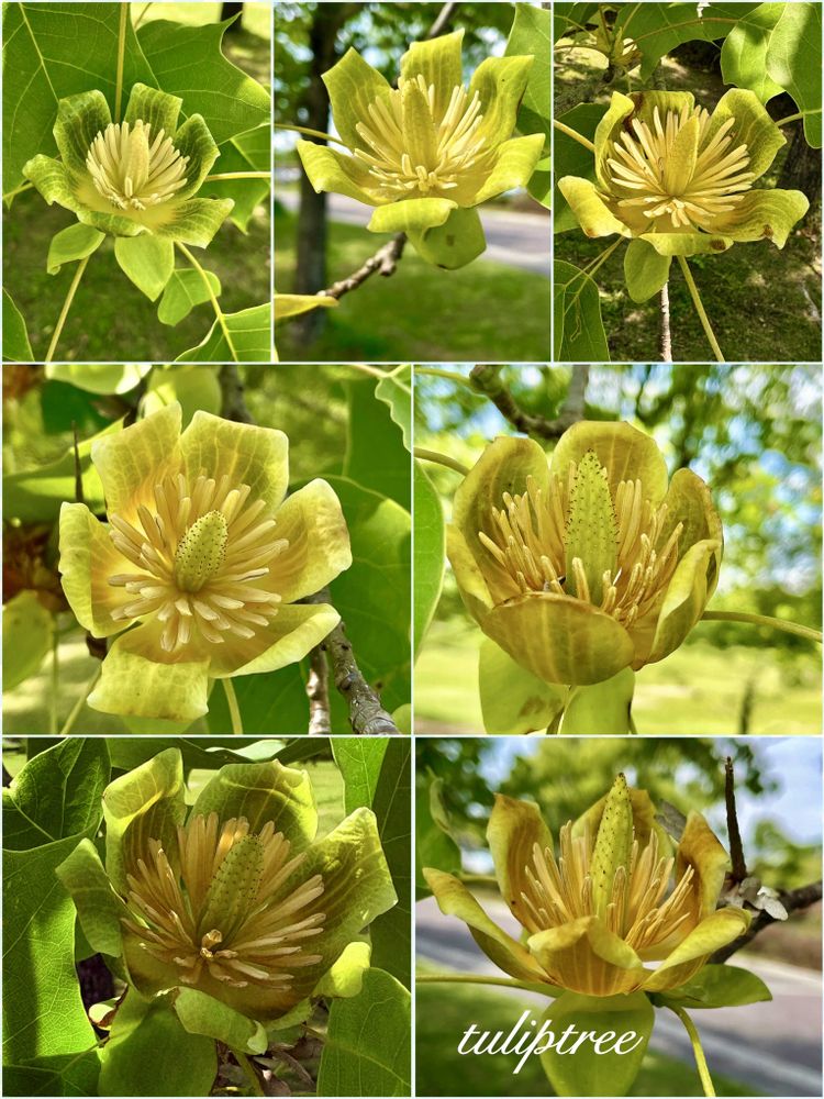普通のユリノキは真ん中あたりがオレンジ🧡色になりますが、、シナユリノキは緑のままで咲き出しも早いです…ちょうど低い枝が何本もありましたのでいろんなお顔のお花が見れました👍✨