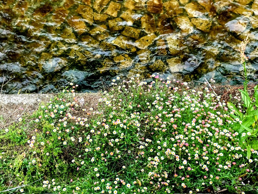 上から撮影,散歩道で出会ったお花,エリゲロンと一の坂川の流れの投稿画像