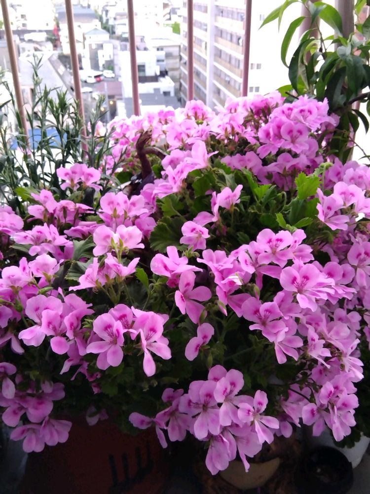アイビーゼラニューム可愛らしいお花を鉢からはみ出し広げ溢れんばかりです