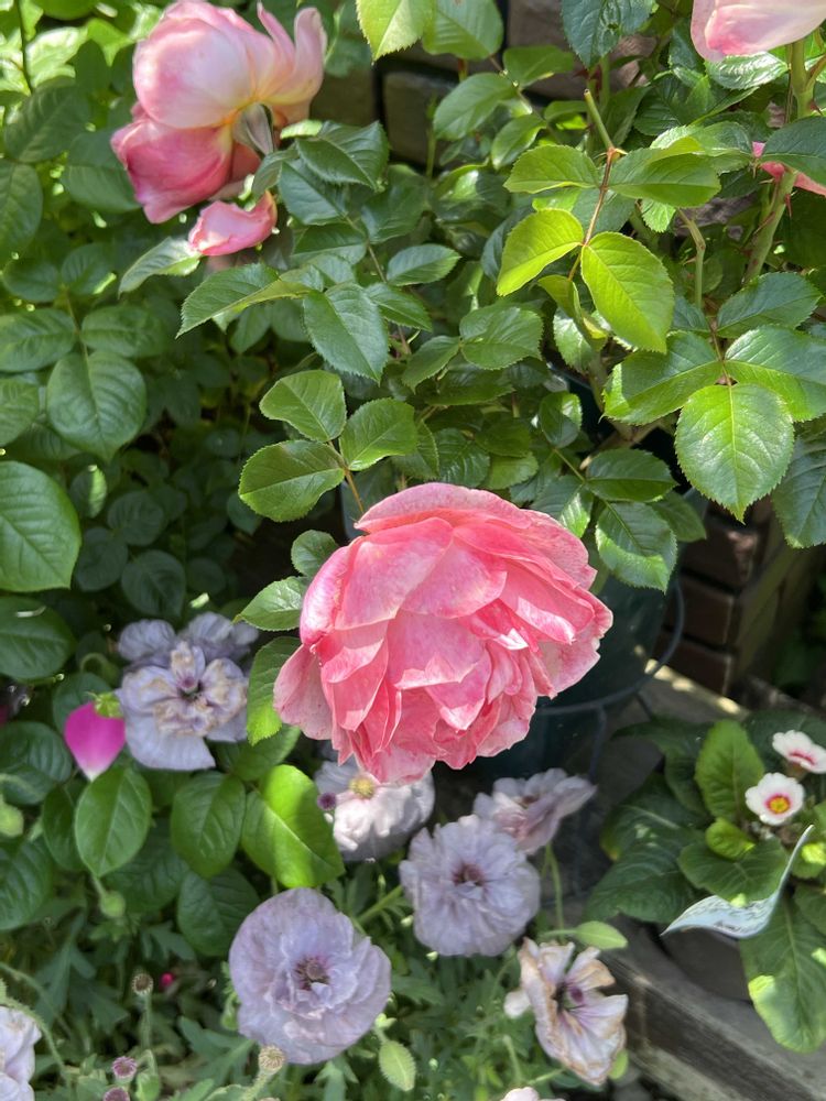 他の植栽も、寄せ植えではなくて、コンテナに一色植えてバラに合わせています
