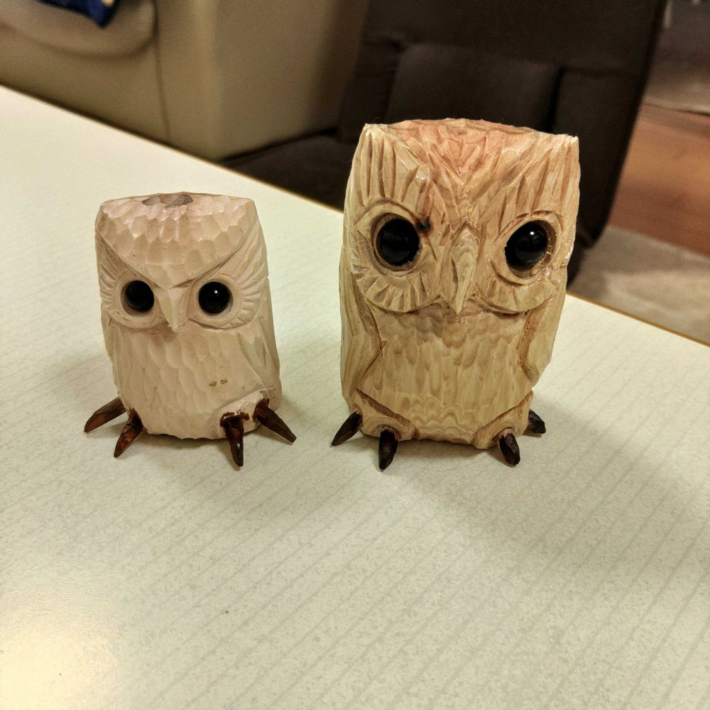 1、地域の100円カフェで🦉の木彫りをされてる方から🦉のストラップとこの写真の🦉を頂きました❤️❤️❤️(この写真の🦉は、私に娘と息子がいると思い作ってくれたそうですが…猫の娘と息子と話をしたらずっこけてました😅)