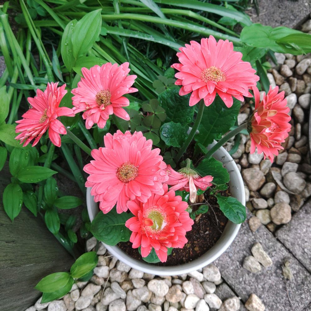 3、私のお気に入りの園芸店で、確か?一昨年にピンクのガ―ベラを迎えたところ、今年は蕾をあわせて9輪咲いてくれそうです💕