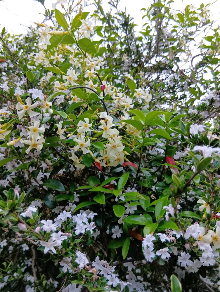 ②お隣さんのハクチョウゲの中にテイカカズラがコラボして、2倍楽しめます♪