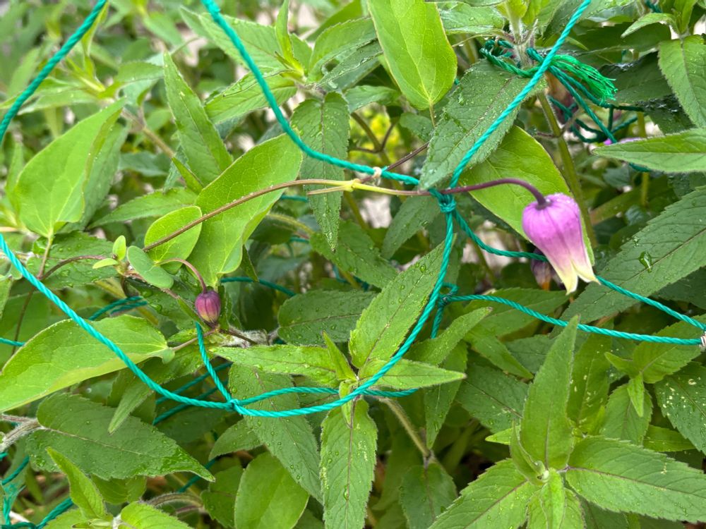 うちは、大きな垣根越しに大輪のテッセンが夢だけど、狭いし難しいので車横の置いてある鉢に緑の支柱にネットを結束バンドで止めて差してそれに絡むようにしてます。ダイアナさんは、軽いし、なんか壺型の方が可愛い?とハマってしまって何種類