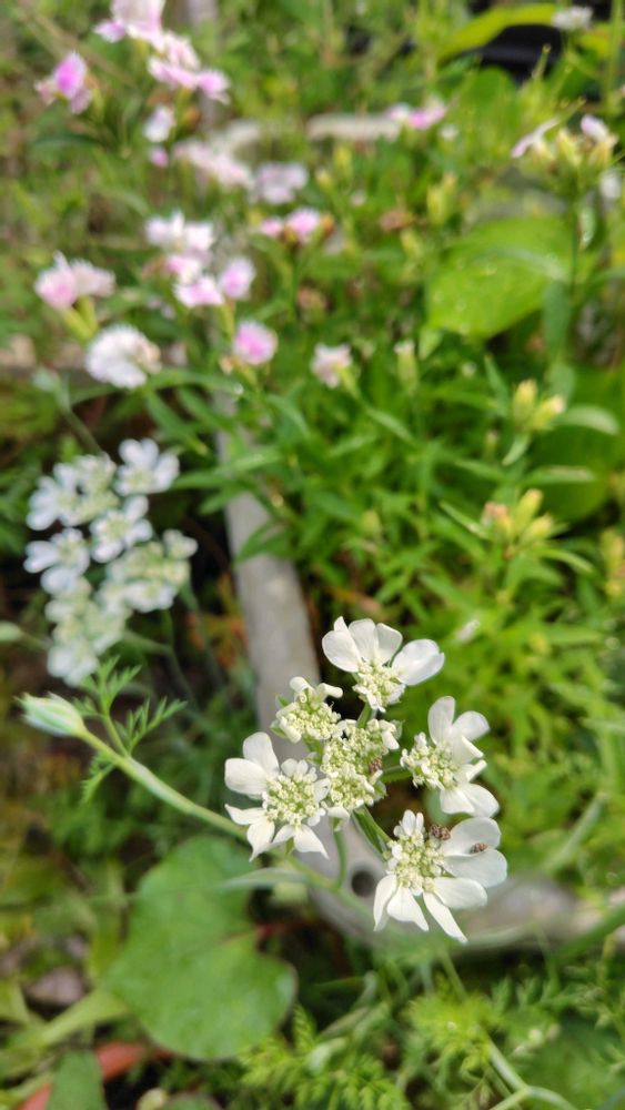 白い花が風に揺れている様子は、本当にかわいいですね…🥰🍀(奥に ぼんやり写っているのはナデシコです🩷🌿)