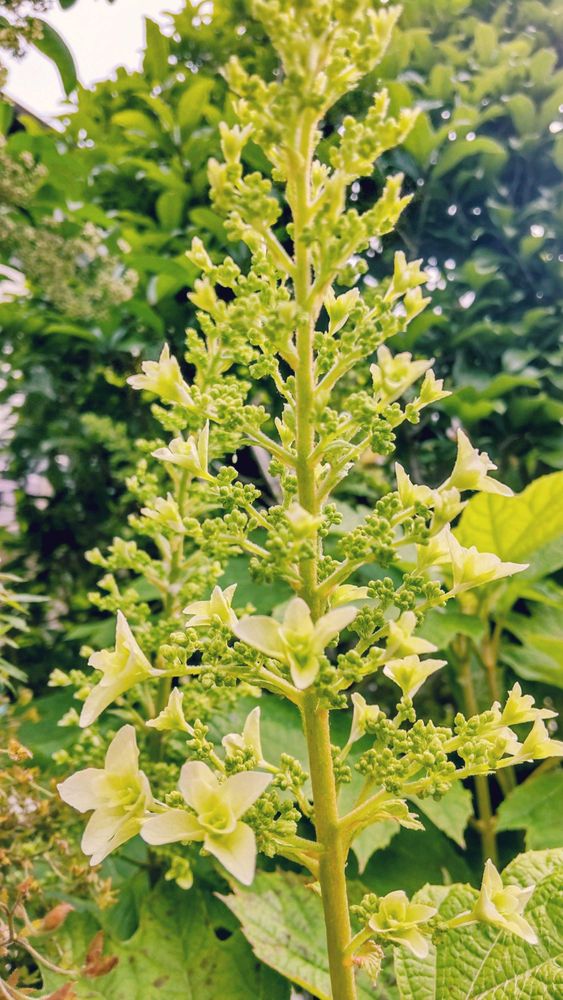 八重咲カシワバアジサイ、蕾がふくらみはじめてます。