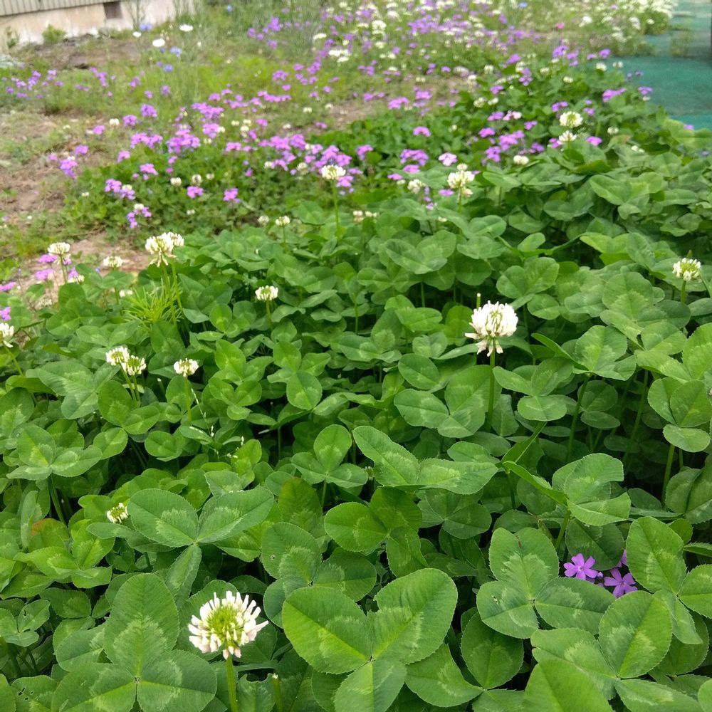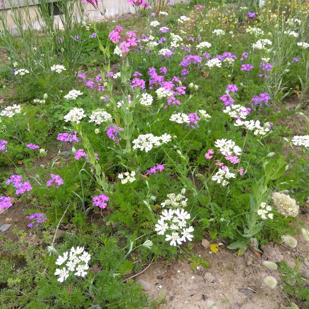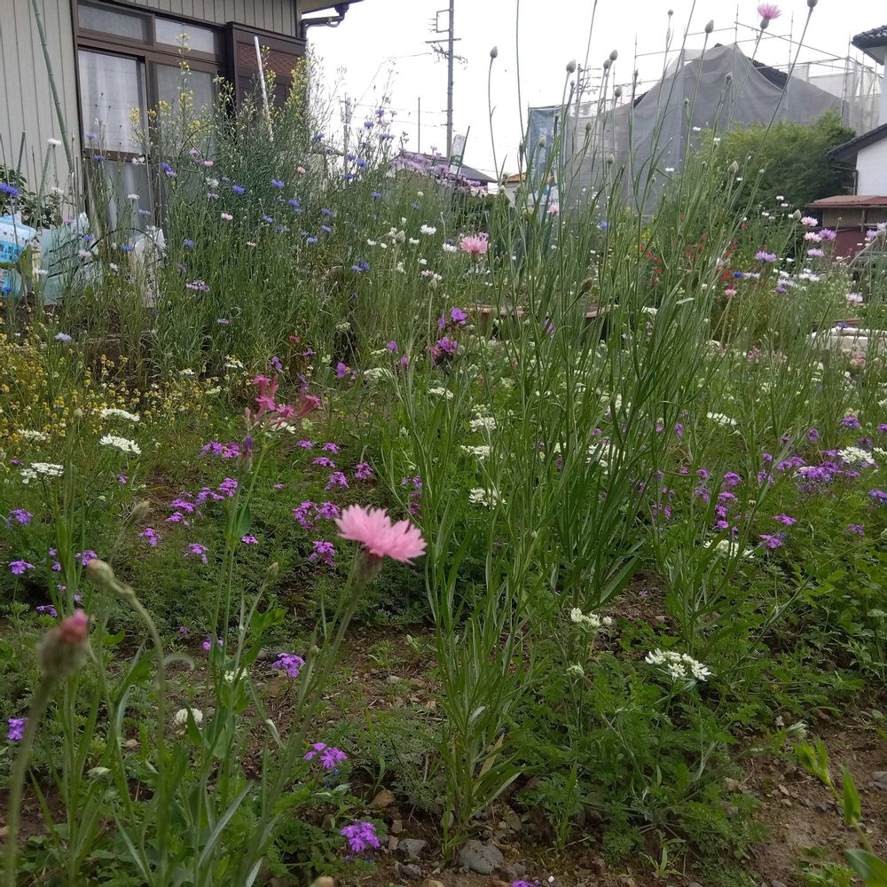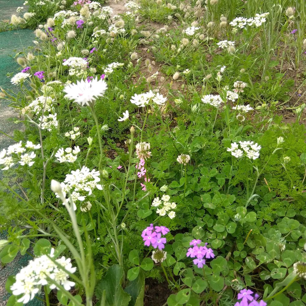 ヤグルマギク、クローバー、シレネ、ムシトリナデシコ、ラグラス、バーベナたちが勝手気ままに咲いてます💜🩷💙💚