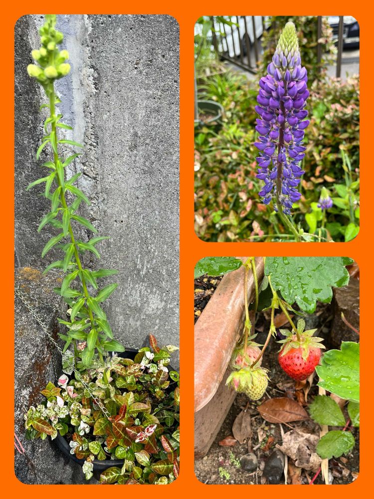 おはようございます。曇り、22.0℃、10:20ちょうどいい。吊るしハツユキカズラにキンギョソウが生え蕾ができました。ルピナス、598日目デカい花が咲きました。いちご、あららこんな所に出来てました、いただきます。垣根朝顔2世、20日目支柱を立て2本苗植えしました。ラベンダー、新芽が出てきたので地植えにしました。子宝弁慶草、1674日目、増えすぎたので、大きいのは処分、植え替えました。😻🥰😍😸😋☺️
