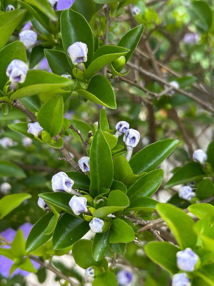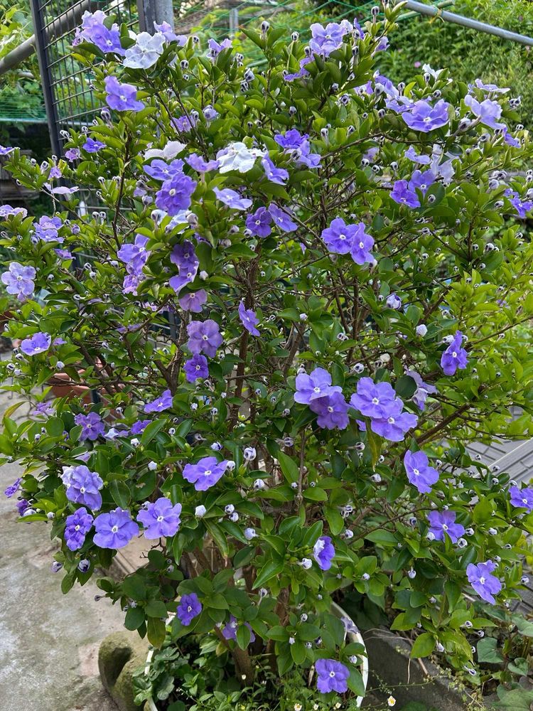 栽培10年以上になるニオイバンマツリ。大きな株に育ったので一昨年、地植えから鉢植えにして玄関先に鎮座してる。