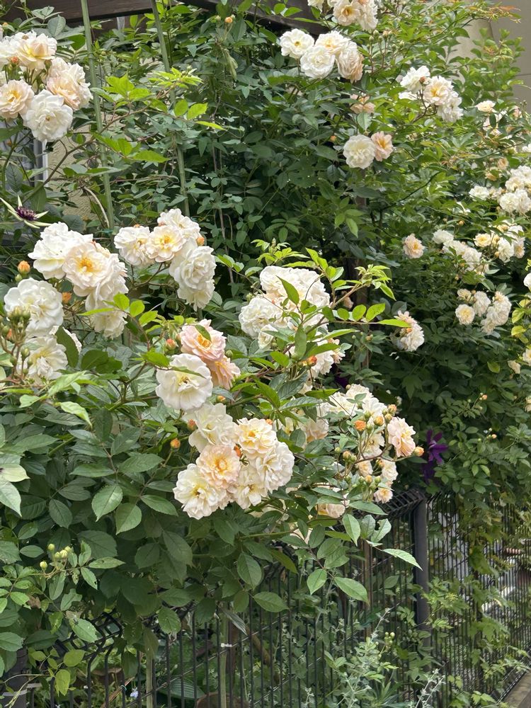 新苗でお迎えしてから何年?凄い事になっています。どんなに内芽で剪定しても外に向かって咲きます😭なのでよそ様の🅿️からパチリです。何か、罪悪感が💦