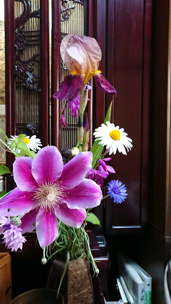 【今日の献花】は、初めてのクレマチス、、、ジャーマンアイリスと紫蘭、フランスキクとヤグルマキクを添えて、、、