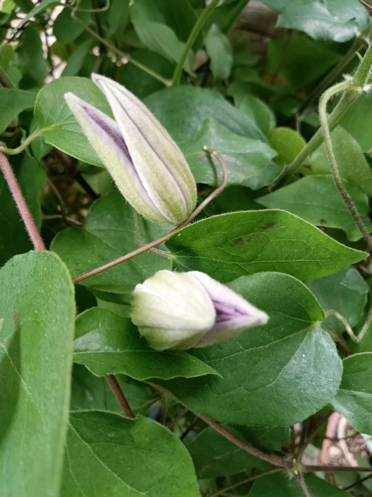 ⑤クレマチスの蕾、開花途中、鳥のクチバシの様な面白い形ですねぇ~🐦️💜