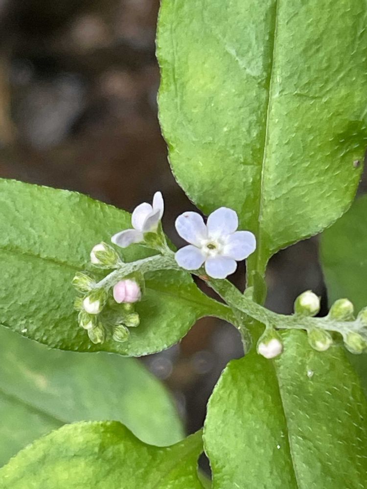 二股に分かれた、サソリ型花序。花はごく淡い水色、咲き始めは淡いピンク。中央の鱗片は白色。葉は楕円形。写真から確認できる事はそれくらいです。