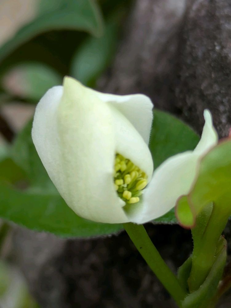 1つの花は、3つに分かれて反り返る雌しべと、それを囲む3本の黄色い葯を付けた雄しべでできています