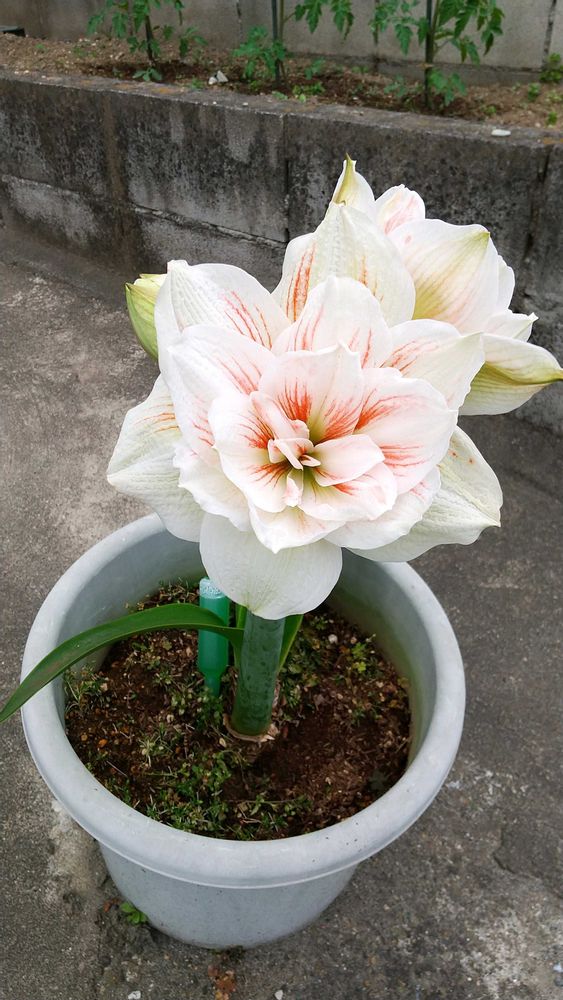 あまりの綺麗さに足を止めて見惚れてしまった八重咲きアマリリス大きな花びらは優美で綺麗でした❗️優しい色合いの白を強調した色に赤い模様が素敵でした❗️