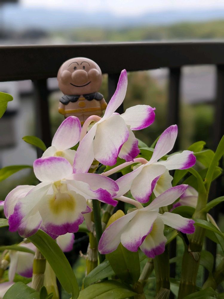 二階テラスではデンドロビウムが2鉢咲き乱れています