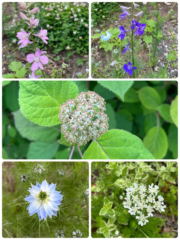 毎年恒例、こぼれ種からラクスパー、ニゲラ、オルラヤが咲き始めました。