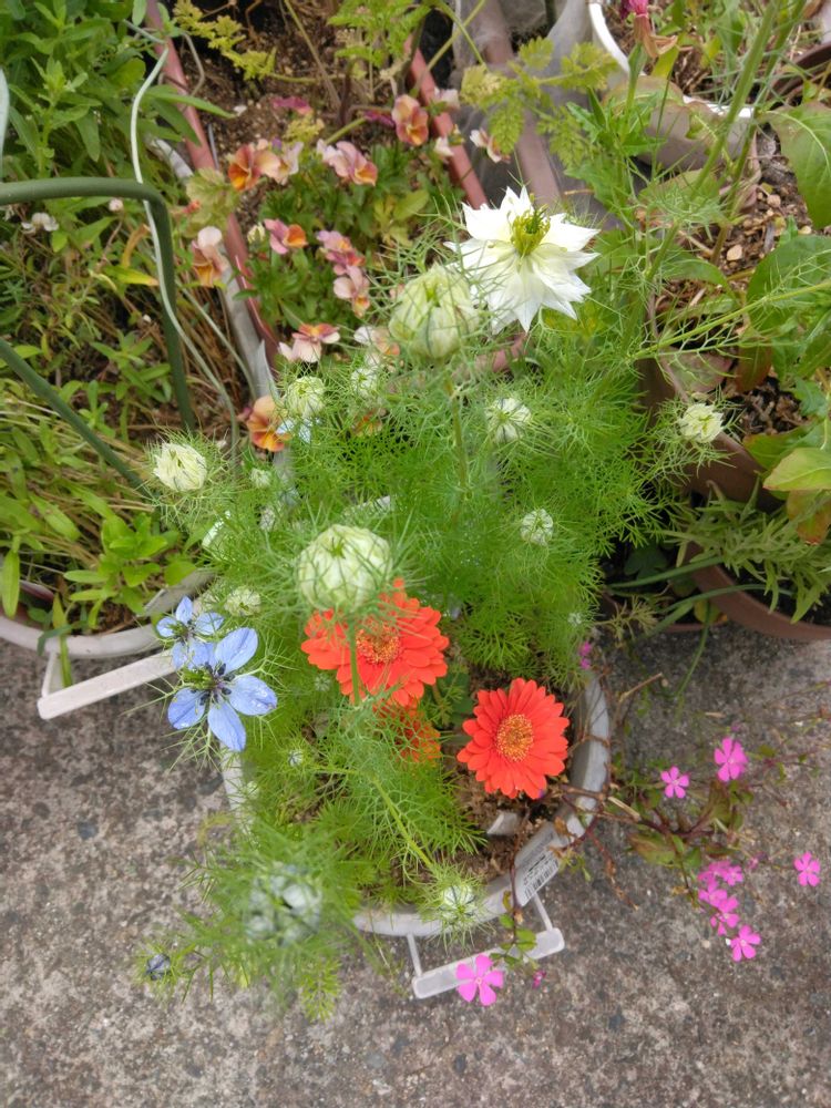 何カ所に種蒔きしたニゲラ、前々から在った品種のと 種を譲って下さったからのと咲かないと判明しない