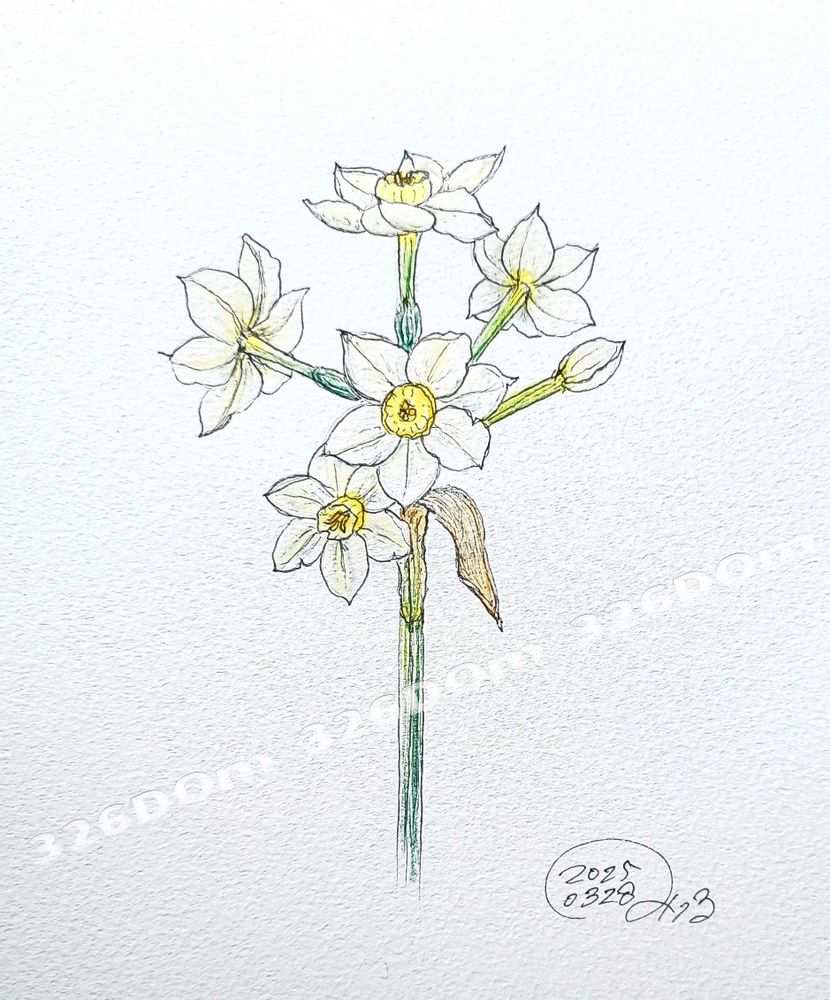 色んな方向を向いた水仙が清楚で初々しいですね。少ない色付けに見えますけど、沢山の色を使っているのですね。だから深みがあるのですね🙂
