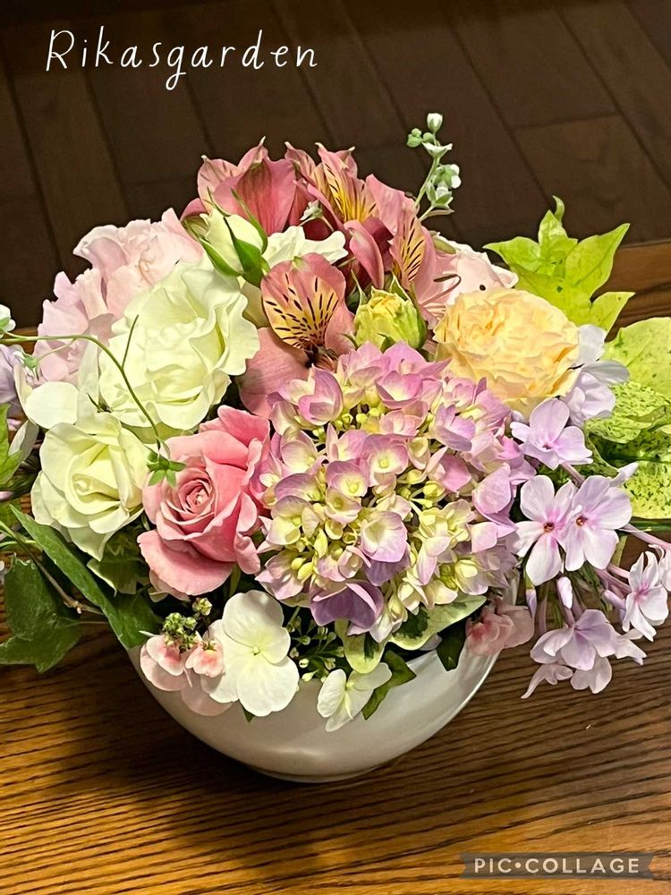 紫陽花(霧島の恵)が色付いてきたので、早速入れてみました。花もちもよい花を選抜してみました💐