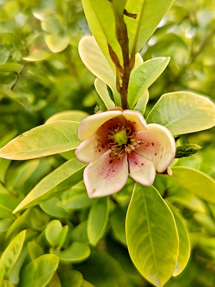 昨日、カラタネオガタマの花を見ました。モクレン科モクレン属の花。葉の繁みに隠れてしまいそうな小さな花です。近くに寄ると、バナナのような甘い香りで気が付きます。
