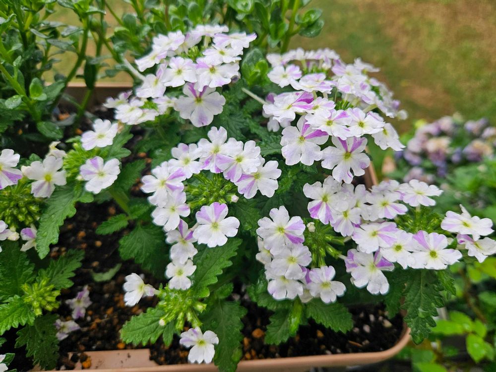 白い花びらに紫色のラインが入るとても綺麗なバーベナです☺️